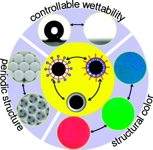 ★ Fabrication and Applications of Photonic Crystals Because of the regulation performance of photon propagation, photonic crystal material is called "optical semiconductor", which has caused intensive attention. We focused on the preparation and applications of photonic crystals (Acc. Chem. Res. 2011, 44, 405-415; J. Mater.Chem. 2011, 21, 14113-14126). Based on structure design, latex particles with hard core and soft shell structure were prepared, which were assembled to photonic crystals with close packed structure and high strength (Macromol. Chem. Phys. 2006, 6, 596-604), as well as controllable wettability (Chem. Mater. 2006, 18, 4984-4986; Adv. Funct. Mater. 2007, 17, 219-225) The slow photon effect of 3D photonic crystals and its enhancement effect on the fluorescence was demonstrated (J. Mater. Chem. 2007, 17, 1237-1241). The photonic crystals were used for high sensitivity detection (Angew. Chem. Int. Ed. 2008, 47, 7258-7262; J. Mater. Chem. 2012, 22, 21405-21411), optical information storage, (Adv. Mater. 2010, 22, 1237-1241) etc.. Through the control of latex particle morphology, the wettability and adhesion could be controlled (Adv. Funct. Mater. 2011, 21, 4436-4441), and photonic crystals with ultra narrow band gap was prepared based on the modulation of interfacial properties (J. Am. Chem. Soc. 2012, 134, 17053-17058; NPG Asia Mater.2012,4,e21) Furthermore, the photonic crystals were used in high performance solar cell concentrator, light catalysis and so on (J. Mater. Chem. 2008, 18, 2650-2652; Energ. Environ. Sci. 2010, 3, 1503-1506). The polymer latex particles also could be used in inkjet printing technology (J. Mater. Chem., 2009, 19, 5499 - 5502), which allowed the dyes pigment was instead of the structure color, and provided new materials and solutions to environmental friendly printing technology (J. Mater. Chem. C. 2013,DOI: 10.1039/C3TC30728J). Printed photonic crystal detection chips and their applications were further developed (Lab Chip 2012, 12, 3089-3095;J. Mater. Chem.2012, 22, 21405-21411). Based on the difference of substrate wettability, the photonic crystal chip with multi band gap array was designed and fabricated, and the photonic crystal chip could efficiently detect and identify multi substrate (Angew. Chem. In. Ed. 2013, 52, 7296-7299). |