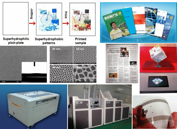 ★ Green Printing Materials and Technologies Printing industry is one of the backbone industries in China. The mainstream plate-making technology in China is Laser Typesetting, and Computer-To-Plate. Both technologies are based on the photosensitizing process. Therefore they inevitably include complex processes, which cause problems of high cost, and serious pollution. Through the long-time and in-depth research with nano materials and printing science (Chem. Soc. Rev. 2013, 42, 5184-5209; Adv. Mater. 2013, 25, 2291-2295), a kind of non-photosensitive, non-pollution, and inexpensive nanometer green plate making technology is developed and the environmental pollution in the process of plate making is expected to be solved completely. So far, the green printing technology has been broken through in critical materials, high speed and high precision green plate making equipment, as well as the bundled software, and more than 50 patents were applied or granted. We further developed environment friendly plate-base technique as well, and the huge environmental pollution and energy consumption in the traditional electrolytic oxidation process could be solved completely. The water-based ink for plastic gravure printing has been developed via enterprise cooperation and also realized industrialization. The green printing technology has been extended to printing electronics, printing and dyeing textiles, Printing and patterning of building materials and so on. It is expected that completely green printing industry technical chain will be developed based the innovation of nano-materials.