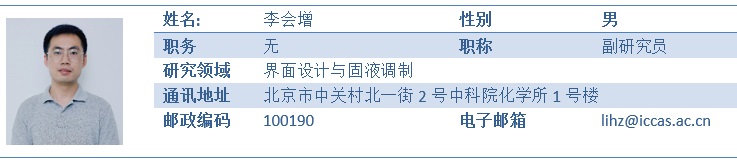 李会增,男,汉族,1990年生于河北省,副研究员,博士(后)。2012年7月毕业于燕山大学获理学学士学位,2018年7月于中国科学院大学获理学博士学位,同年在博新计划资助下于中科院化学所开展博士后研究,2021年12月任中科院化学所助理研究员,2022年3月任副研究员。