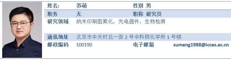 苏萌,男,汉族,1988年生于河南省,研究员,博士。2012年7月毕业于郑州大学获理学学士学位,2017年7月于中国科学院大学获理学博士学位,2017年7月到中国科学院化学研究所参加工作。