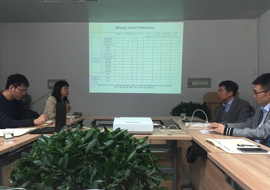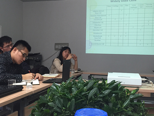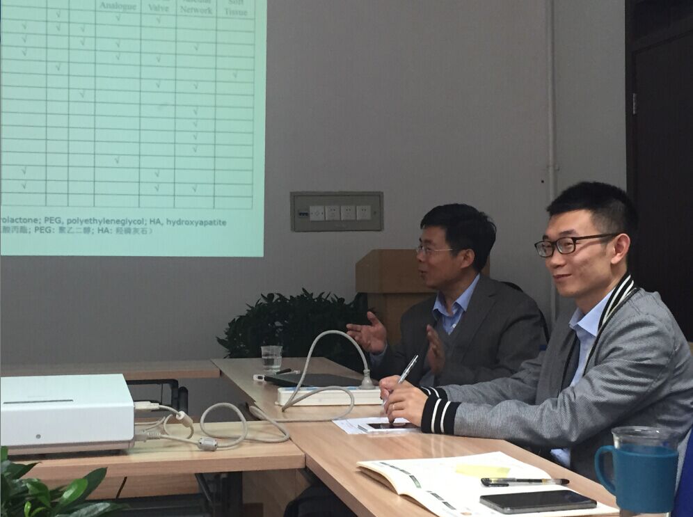 2015年10月10日上午9:00,中科院遗传与发育生物学研究所王秀杰研究员带队到课题组进行学术交流,双方课题组老师和同学分别就打印和检测方面内容作了学术报告。宋延林研究员向前来的老师同学对课题组的相关研究工作进行了介绍,李风煜副研究员、杨强博士分别就静电纺丝、打印喷头方面进行了报告,遗传所的张则宇博士则介绍了3D生物打印方面的研究。他们的报告引起了在座师生的广泛兴趣,会后还进行了热烈的讨论并擦出了合作的火花,为今后的课题组间更密切的合作打下基础。下图是宋延林研究员和王秀杰研究员在参与讨论。