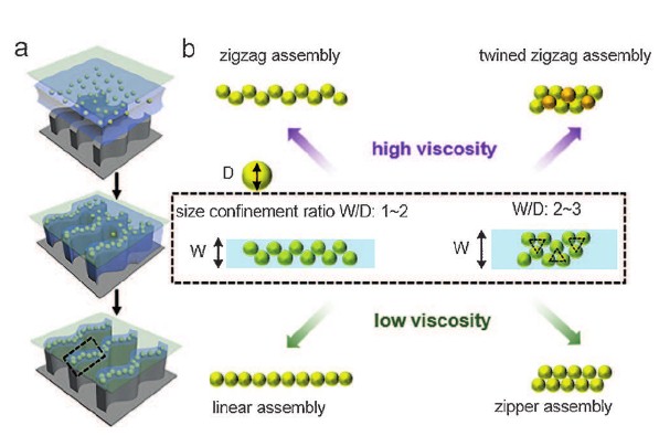 Precise control of particles assembly has tremendous potential for fabricating intricate structures and functional materials. However, it is still a challenge to achieve onedimensional assembly with precisely controlled morphology. An effective strategy is reported to precisely assemble particles into well-defined patterns by liquid confinement through controlling the viscosity of the assembly system. It is found that high viscosity of the system impedes particles rearrangement and facilitates the generation of zigzag or twined zigzag assembly structures, while low viscosity of the system allows particles to rearrange into linear or zipper structures driven by lowering the surface deformation of the liquid. As a result, precise control of different assembly patterns can be achieved through tuning the viscosity of solvent and size confinement ratios. This facile approach shows generality for particles assembly of different sizes and materials.