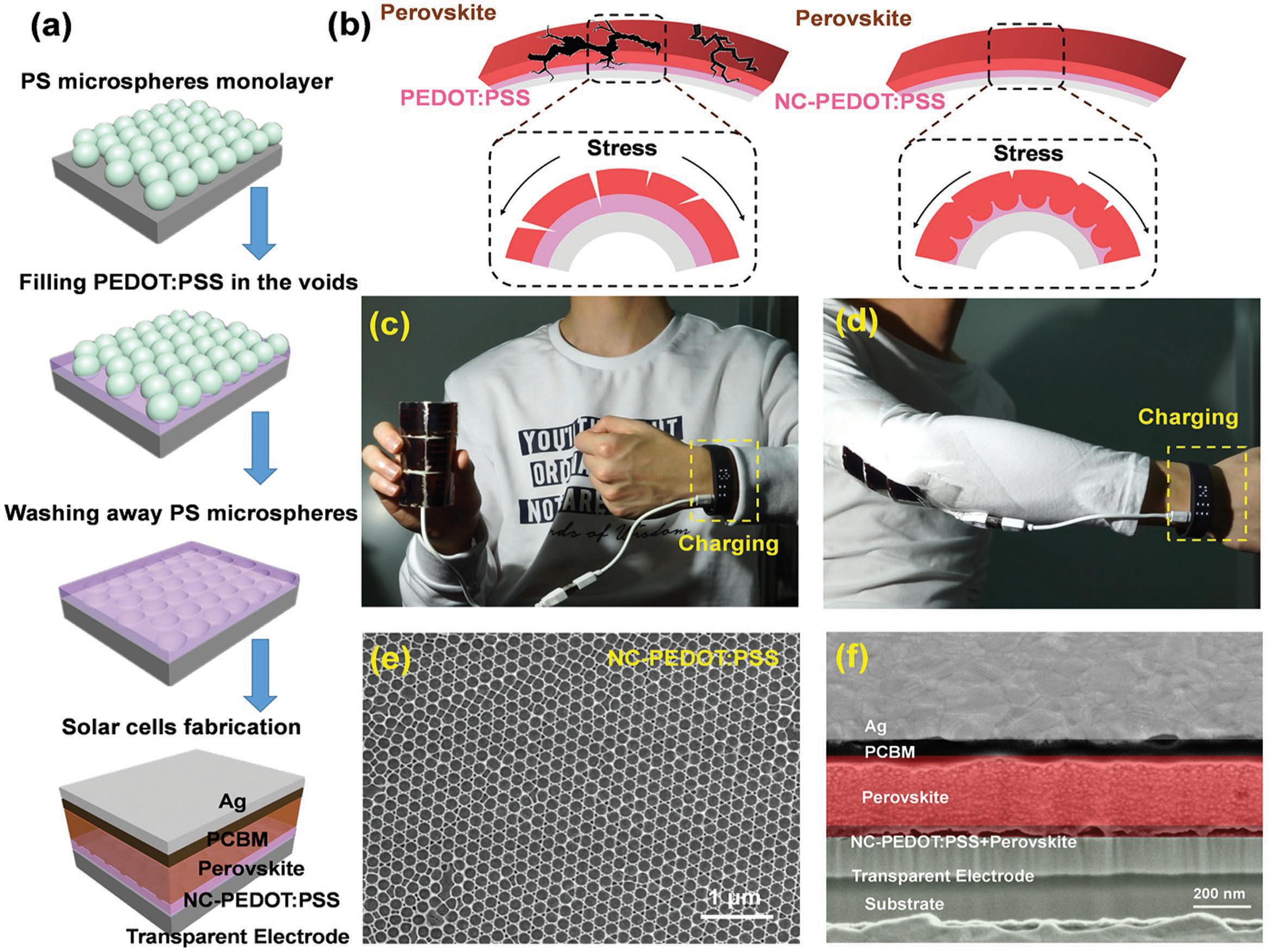 Dramatic advances in perovskite solar cells (PSCs) and the blossoming of wearable electronics have triggered tremendous demands for flexible solar-power sources. However, the fracturing of functional crystalline films and transmittance wastage from flexible substrates are critical challenges to approaching the high-performance PSCs with flexural endurance. In this work, a nanocellular scaffold is introduced to architect a mechanics buffer layer and optics resonant cavity. The nanocellular scaffold releases mechanical stresses during flexural experiences and significantly improves the crystalline quality of the perovskite films. The nanocellular optics resonant cavity optimizes light harvesting and charge transportation of devices. More importantly, these flexible PSCs, which demonstrate excellent performance and mechanical stability, are practically fabricated in modules as a wearable solar-power source. A power conversion efficiency of 12.32% for a flexible large-scale device (polyethylene terephthalate substrate, indium tin oxide-free, 1.01 cm2) is achieved. This ingenious flexible structure will enable a new approach for development of wearable electronics.