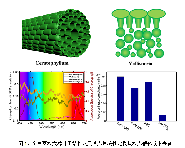 光催化材料在能源环境方面具有重要意义。本课题结合国内外的发展,研究制备了多种光捕获结构,从而提高光催化作用(J. Mater. Chem. A, 2013, 1, 541-547; J. Mater. Chem. A, 2013, 1, 7760–7766)。沉水植物因为长期生活在水下,为了适应水下低光低氧环境从而进化了适应这种环境的特殊结构。在以前的工作中,我们研究了大蓉水草的结构,通过表皮细胞的光聚合作用,栅栏组织的光波导作用以及海绵组织的光散射作用,大大提高了材料的光催化性能。(J. Mater. Chem. A, 2013, 1, 7760–7766)在这个工作中,我们研究了针叶状的金鱼藻水草。通过比较和模拟(图1)发现,金鱼藻结构的光捕获性能优于大蓉的。这种优势主要来源于金鱼藻水草特有的双层结构(表皮组织和海绵组织),以及这种针叶状的光波导作用。并且金鱼藻水草的仿生结构具有更好的光催化性能。此成果发表于RSC Adv., 2015, 5, 11096–11100。