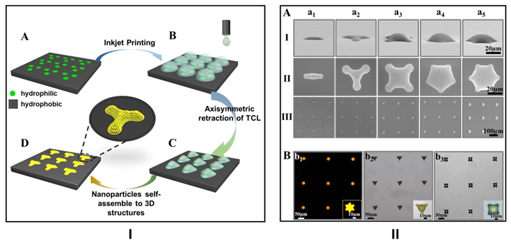 图1. I在亲疏水图案化基底上精确打印三维结构的示意图;II制备得到的不同三维结构光子晶体的SEM图像(A)以及不同组成成分的三维结构的光学图像(B)。