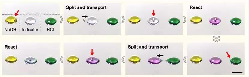 操纵液滴完成酸碱中和反应 (图片来源:宋延林课题组)