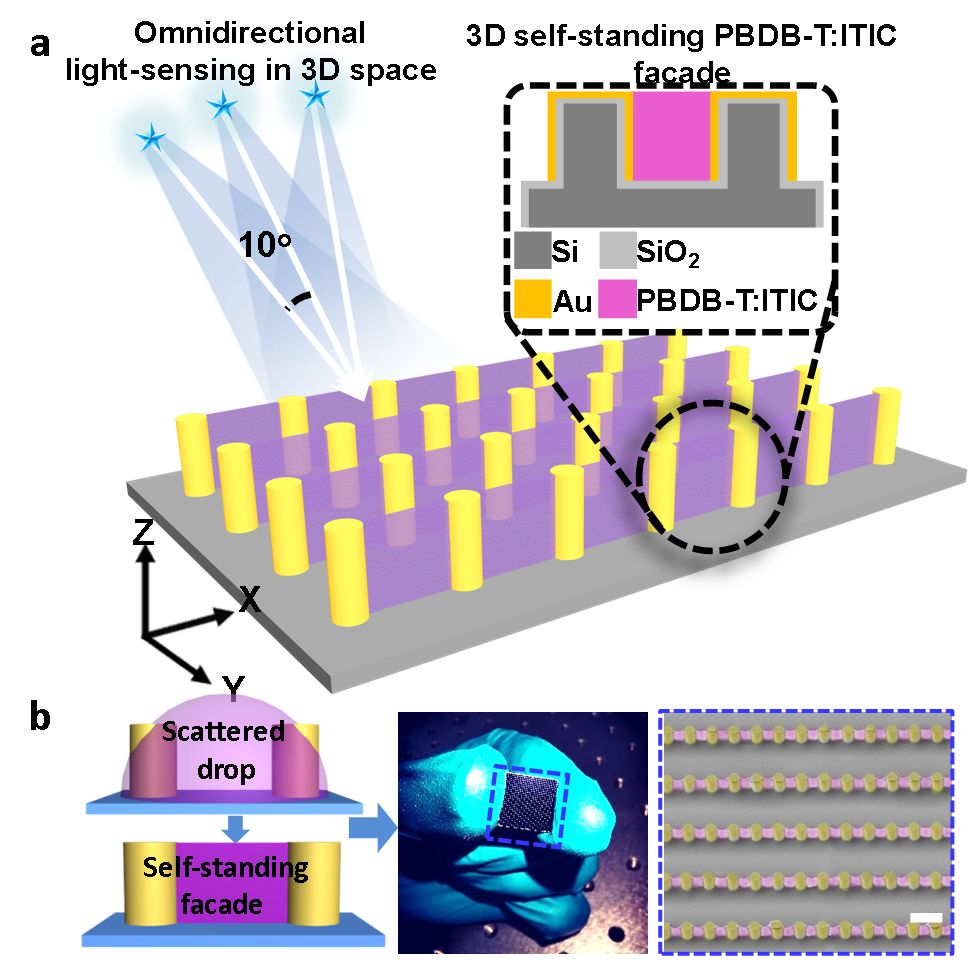 亚波长尺度材料结构与光的共振作用,是操控光-物质相互作用的基础。相较于空间对称结构,非对称结构与不同入射角度光的共振作用差异性更加明显。这种共振作用的差异,决定了材料对光吸收的强弱,从而使其具有光角度识别的功能。近日,中科院化学研究所宋延林研究员课题组通过操控液滴三维成型印刷制造具有非对称共振结构的立面型光探测器,实现了空间全向角度的有效探测,验证了结构与功能一体化印刷制造新策略。(如图1a)