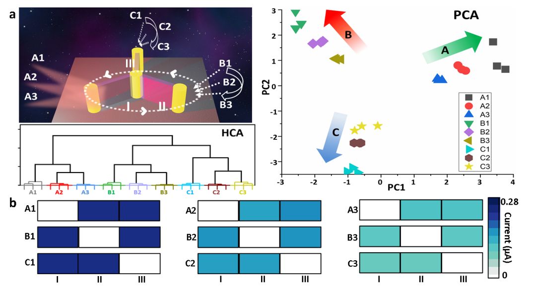 他们进一步将印刷微模板设计成"叉状"结构。溶液在电极间通过同样的方式收缩成型,最终形成三维"叉状"立面探测器。对组合中三个立面探测器的光电流数据分析结果表明,这种"叉状"立面探测器实现了空间全向角度的有效探测 (图3)。该工作为三维微纳光电器件的设计和制备提供了新的方法和思路。