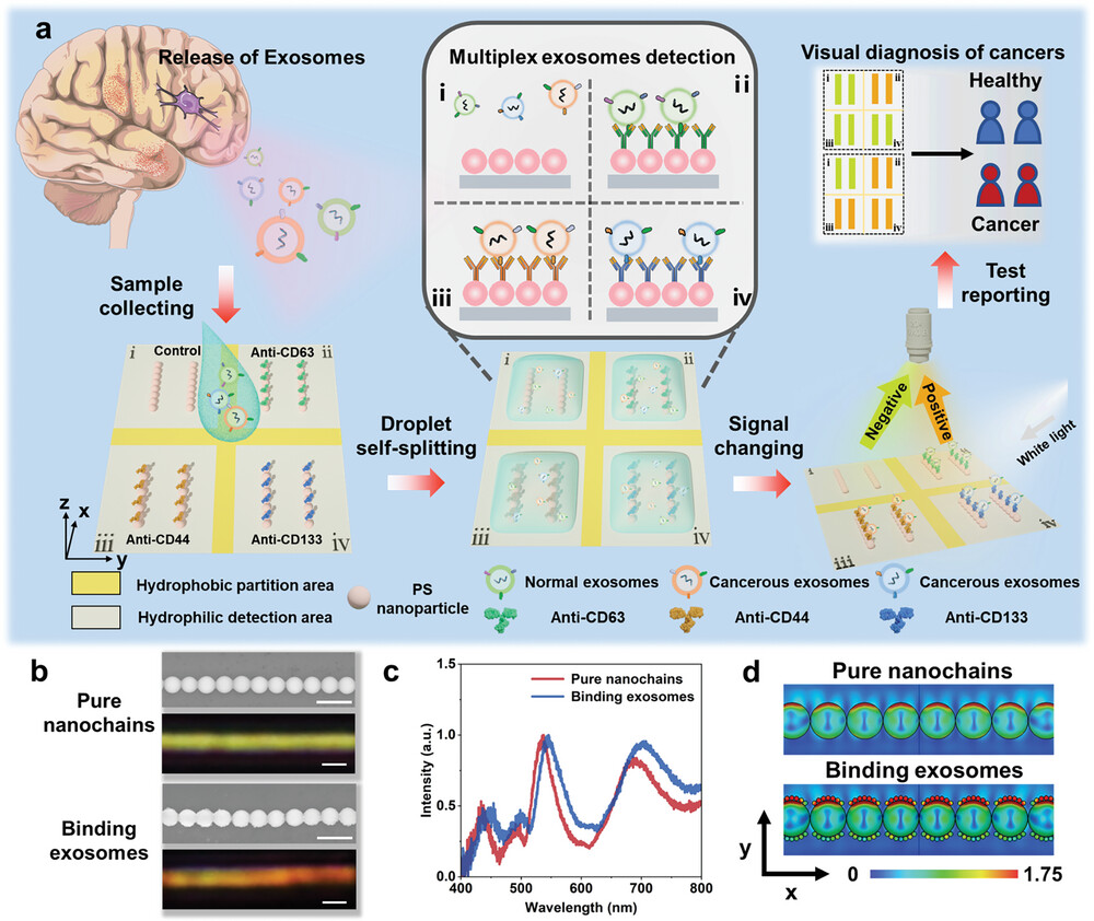 最近,该课题组将印刷一维纳米链与表面图案化结合,设计了一种分区的光学生物检测芯片。他们首先利用酰胺反应在一维纳米链上孵育了特异性抗体,用以捕获目标外泌体颗粒。实验发现,当一维纳米链捕获外泌体颗粒后,基于共振诱导的近场增强作用,纳米链的散射光颜色发生了人眼可分辨的变化。通过设计具有亲疏水图案的基底,制备了一系列多通道分区生物检测芯片。利用生物芯片表面显著的浸润性差异,单个待测液滴被分割成若干互不干扰的微液滴,实现了快速区分正常人与胶质瘤患者的外泌体样本。这种分区光学生物芯片操作简单,成本低,且在复杂生物液体环境中具有良好的特异性和稳定性,有望成为一种新型的疾病诊断方式,促进液体活检、健康监测等相关领域的发展。相关研究成果近期发表在Adv. Mater., 2023, 2304935(DOI: 10.1002/adma.202304935),文章第一作者是博士生杨旭,通讯作者是宋延林研究员,苏萌研究员和张泽英博士后。