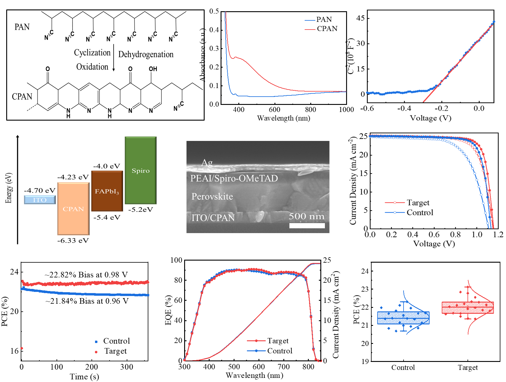 近期,该课题组在钙钛矿电池中电子传输材料研究方面取得新进展。常规的钙钛矿电池中一般使用N-型无机氧化物半导体(二氧化钛,二氧化锡等)作为电子传输层。这种溶液涂布的无机半导体一般需要高温热处理工艺,不利于柔性电池的制备;另外,这些无机半导体对紫外光敏感,影响钙钛矿电池的光伏性能和稳定性。研究人员采用原位环化聚丙烯腈作为电子传输层,取代传统的无机氧化物半导体制备高效和稳定的钙钛矿电池。他们首先将聚丙烯腈溶液涂布到导电玻璃基底上,然后通过热处理原位形成环化聚丙烯腈薄膜。这种原位环化聚丙烯腈覆盖度好,表现出良好的电子传输性能(电子迁移率:4.13 x 10-3 cm2 V -1 s -1)。基于这种环化聚丙烯腈电子传输层的钙钛矿电池呈现出良好的光伏性能和稳定性。