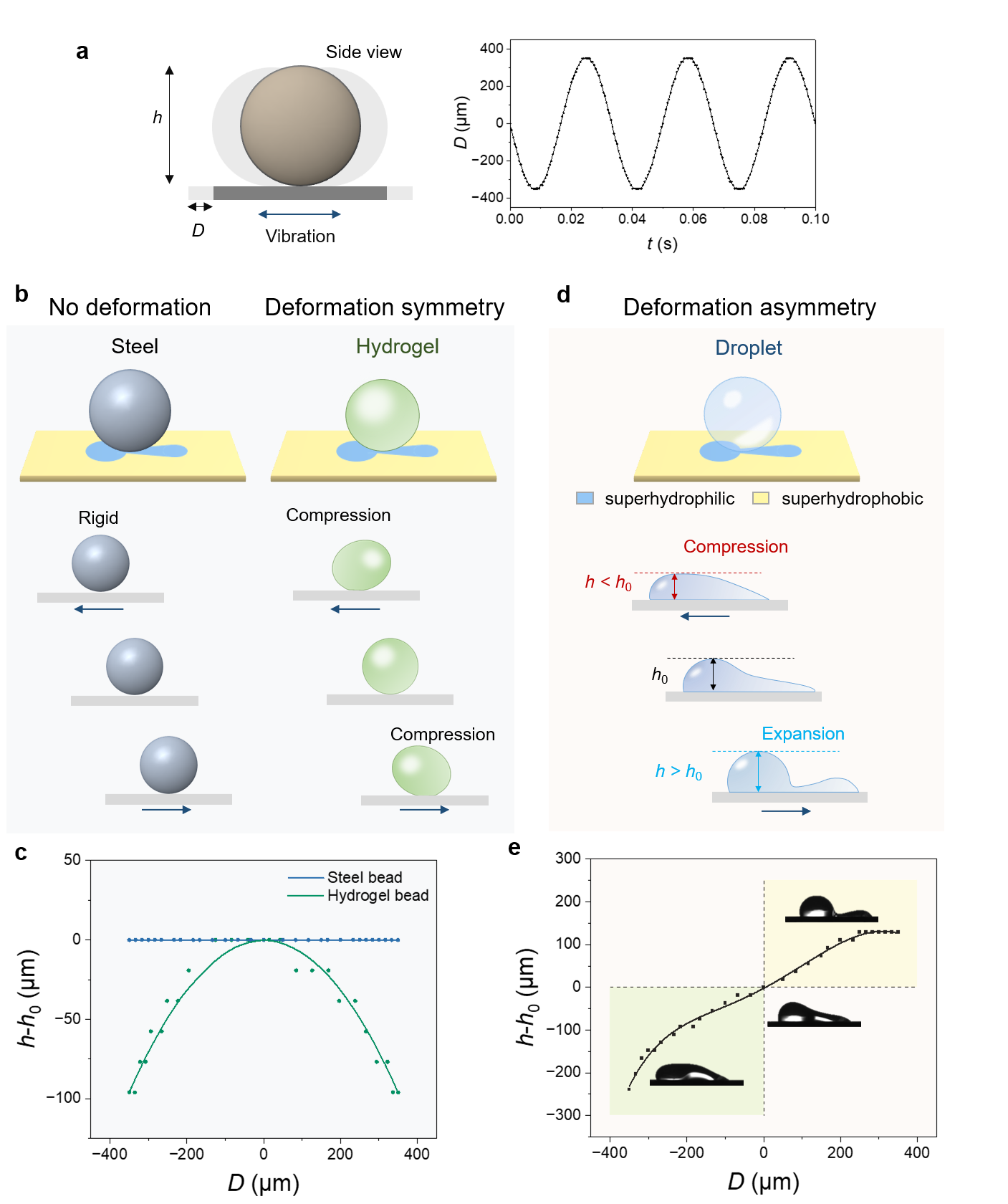 图1 液滴表现出不同于刚体和水凝胶的振动行为,能在浸润性图案的调控下将对称的振动输入转化为不对称的振动输出