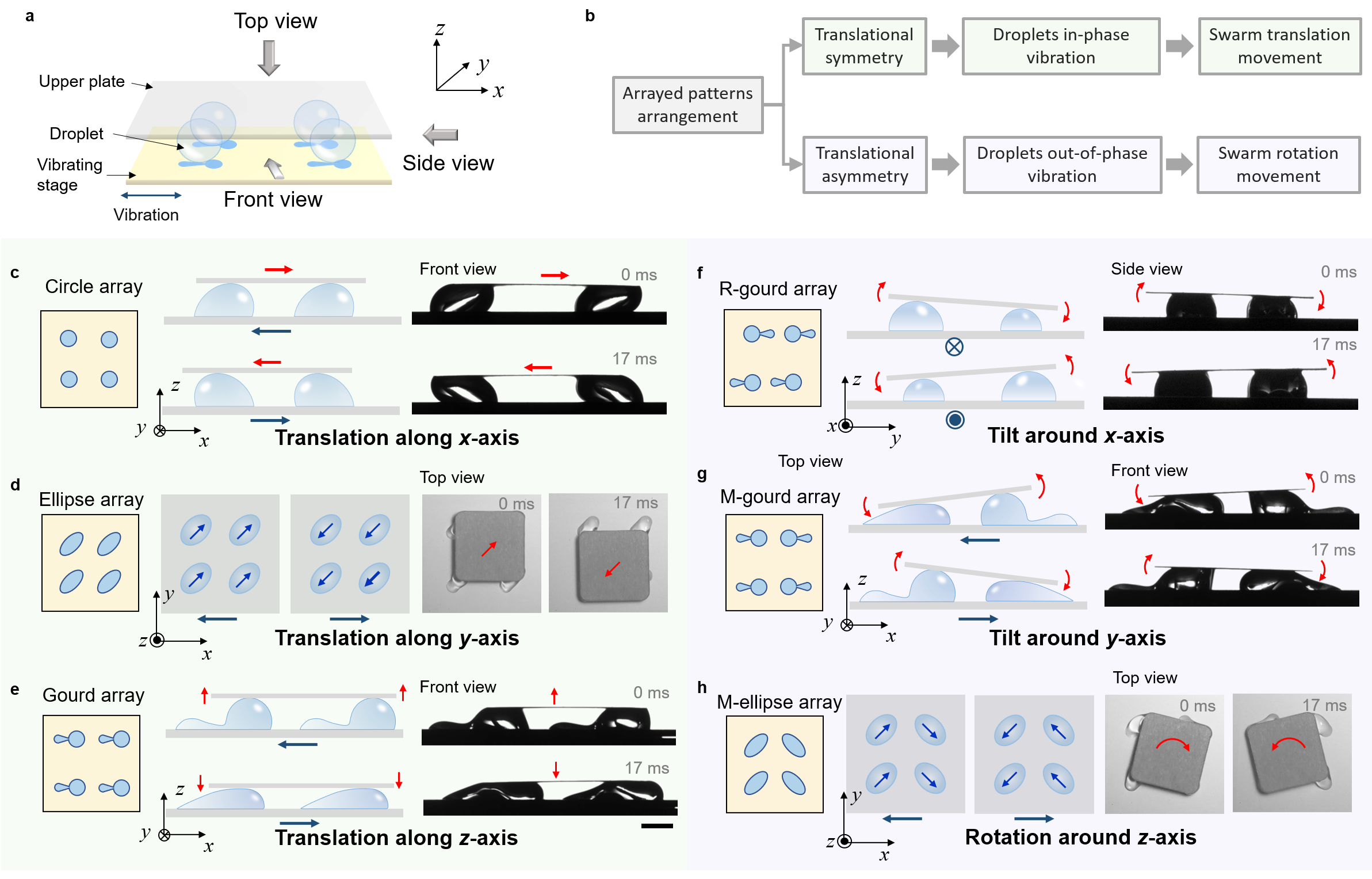 近期,该课题组在通过图案化浸润性调控液滴振动行为方面取得新进展。振动转换广泛应用于能量收集、信号传输和微机电系统等领域。实现机械运动或能量的非对称转换通常使用超材料机器人或不对称微纳结构,需要持续的能量输入,制备复杂,且输出模式有限。研究人员探索了利用浸润性图案化基底调控液滴振动行为的方法,实现了对特定振动的对称/非对称转换和多模式响应。当基底水平振动时,液滴的振动行为受到浸润性图案对称性的调控,可以表现出对称或非对称的振动转换。利用图案阵列调控液滴阵列行为,形成基于液滴的机械转换器系统,可以在输入振动固定的情况下实现目标基板的三维多模式驱动,包括沿x轴、y轴、z轴的平动和绕x轴、y轴、z轴的转动。在此基础上,他们展示了液滴机械转换器在抗震设计、物体定向输运和激光调制中的应用。