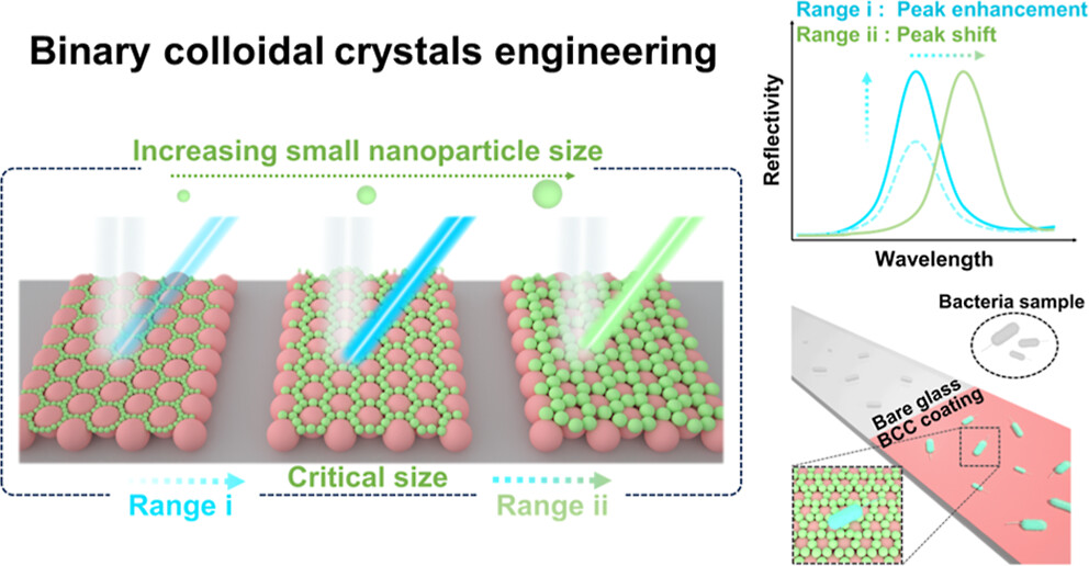 最近,该团队结合界面转移和可控蒸发的策略,精细印刷制备了二元胶体晶体结构,实现了多维共振性质的便捷调控,并应用于细菌的高对比度成像。他们通过调控胶体墨水的溶剂组成对二元纳米颗粒的结晶过程进行控制,制备出多种形貌的二元胶体晶体结构。研究发现,二元胶体晶体结构中存在临界尺寸,可以实现多维共振性质的协同调控。当胶体颗粒尺寸小于临界尺寸时,可以独立地调控晶格共振的强度;反之,则可以影响晶格共振的波长。该二元胶体晶体有强的光限域效应,可用于细菌成像。与临床常用的检测方法相比,无需染色即可将色差提高一个数量级,从而可以灵敏准确地监测微生物。该方法可以简单有效地调控胶体晶体的多维共振性质,有望促进信息显示、生物检测等多功能光学器件的开发。相关研究成果近期发表在J. Am. Chem. Soc., 2025,jacs.4c14185(DOI: 10.1021/jacs.4c14185),文章第一作者是博士生杨旭,通讯作者是宋延林研究员,苏萌研究员和张泽英助理研究员。