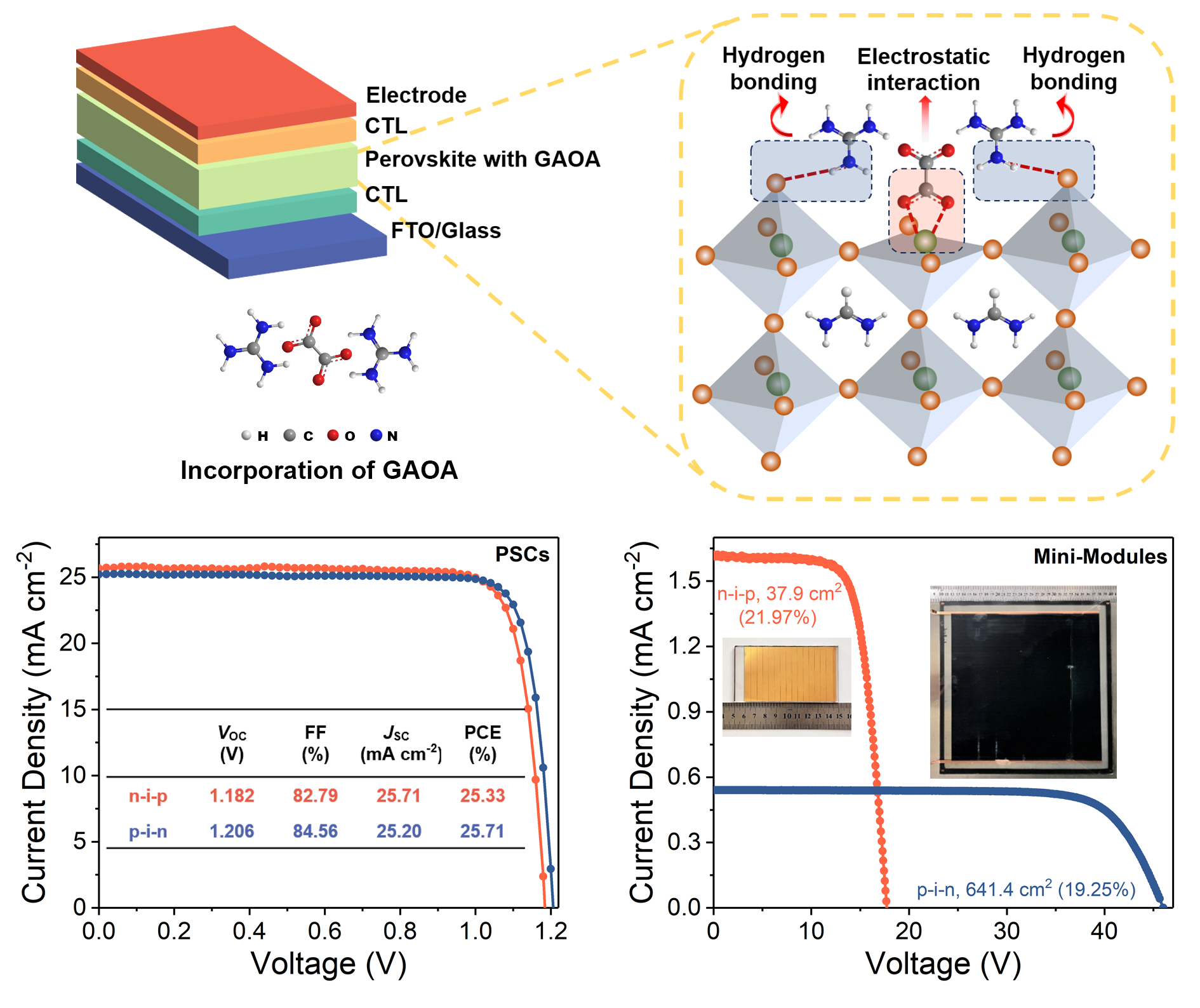 在国家自然科学基金委、科技部和中国科学院的支持下,化学研究所绿色印刷实验室宋延林课题组提出通过分子间相互作用调控结晶动力学,并稳定α晶相来制备大面积钙钛矿光伏模组。研究人员利用草酸胍(GAOA)作为离子对稳定剂,通过分子与Pb-I骨架之间的氢键和双齿螯合静电相互作用,有效调控了钙钛矿δ相到α相的结晶相变速率,促进了高沸点溶剂的挥发,并限制了溶剂挥发过程中组分的损失。在n-i-p和p-i-n结构的钙钛矿太阳能电池中,分别获得了25.33%和25.37%的光电转换效率,大面积钙钛矿光伏模组的有效面积光电转换效率分别达到21.97%(37.9 cm2)和19.25%(641.4 cm2)。相关研究成果近日发表于Energy & Environmental Science期刊上(Energy & Environmental Science,2025,https://doi.org/10.1039/D5EE01031D)。第一作者是博士后郭豪丹,通讯作者是宋延林研究员、汪洋副研究员和西南石油大学黄跃龙教授。