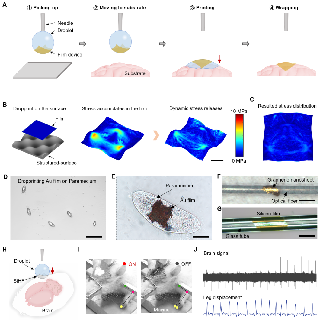 图1. 液滴打印实现薄膜的无应力保形贴附。(A)液滴打印的实施过程;(B)薄膜的动态应力释放过程;(C)薄膜中的应力分布;(D-E)在草履虫上打印的金薄膜;(F)打印在光纤上的石墨烯纳米片;(G)打印在玻璃管上的硅膜;(H-J)通过液滴打印在大鼠模型中构筑的"脑机接口"。